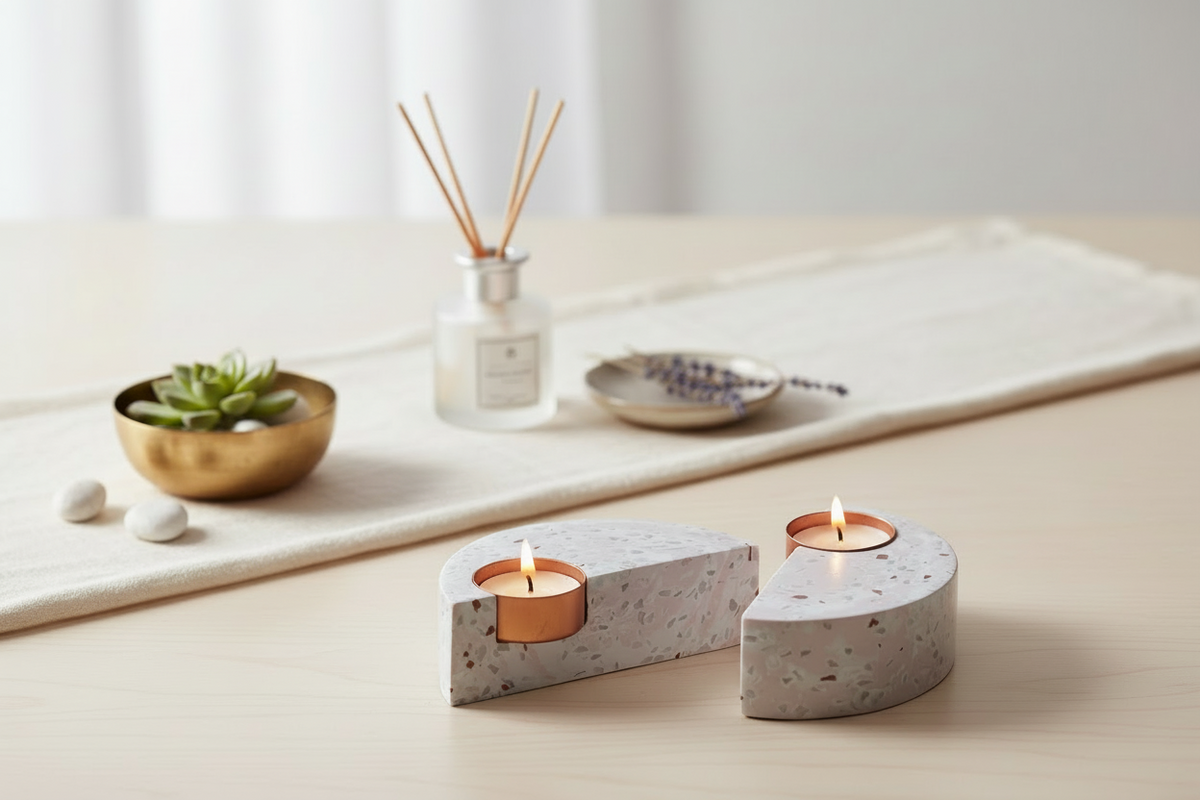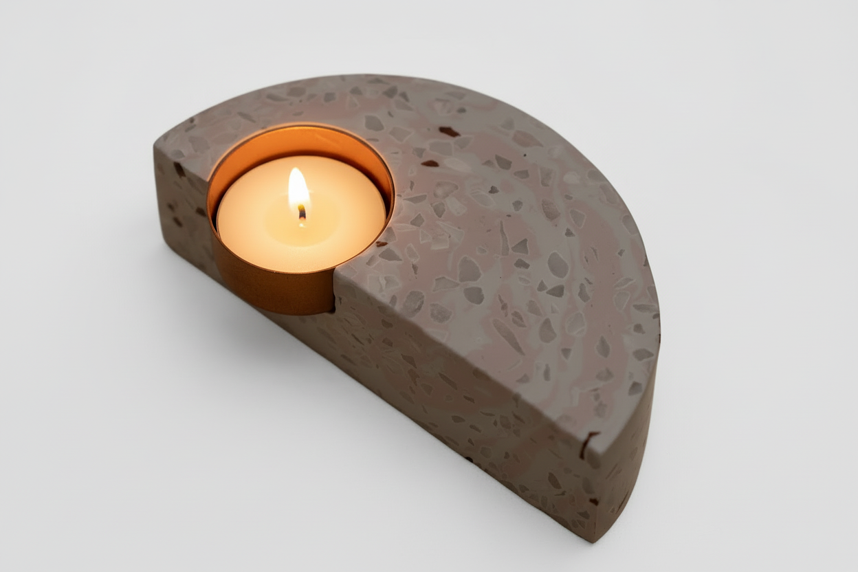 Add a touch of modern elegance to your space with this sleek semi‑circular terrazzo candle holder. Featuring a light pink terrazzo base speckled with black stone chips, it houses a polished gold‑metal cup that cradles a tea light, casting soft, atmospheric glow. The minimalist, geometric design makes it a perfect décor accent for homes, cafés, or events.