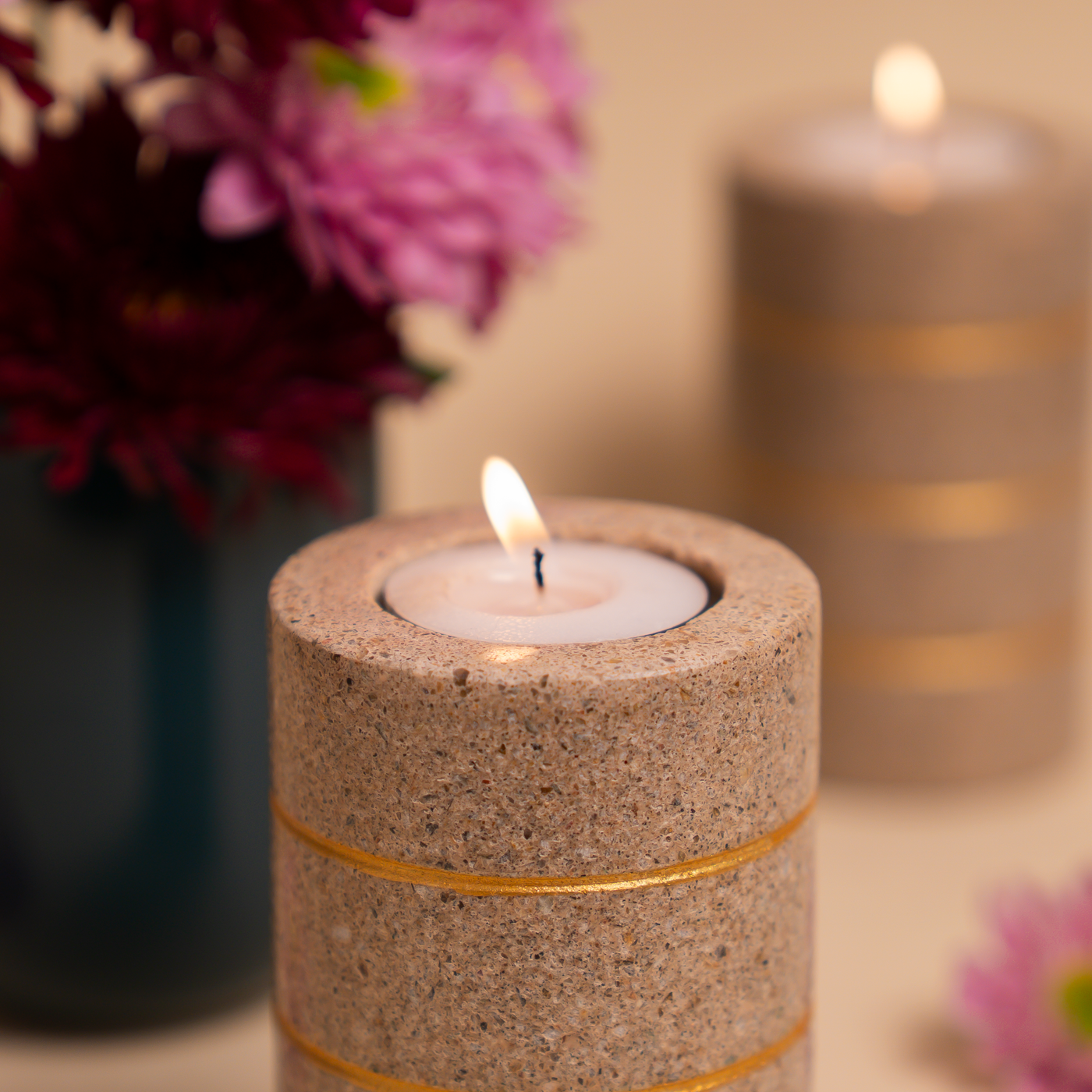 Elevate your ambience with this stunning marble tea light holder, handcrafted with precision. Its sleek, sophisticated design features elegant gold stripe accents on a marble finish, adding a touch of luxury to any room and creating a warm, inviting glow. Perfect for tea lights in living rooms, dining tables, or décor setups.