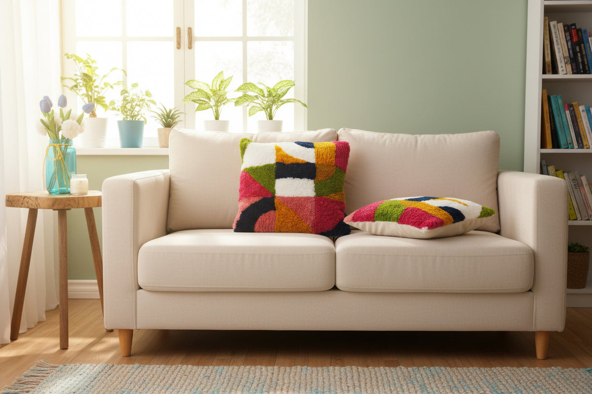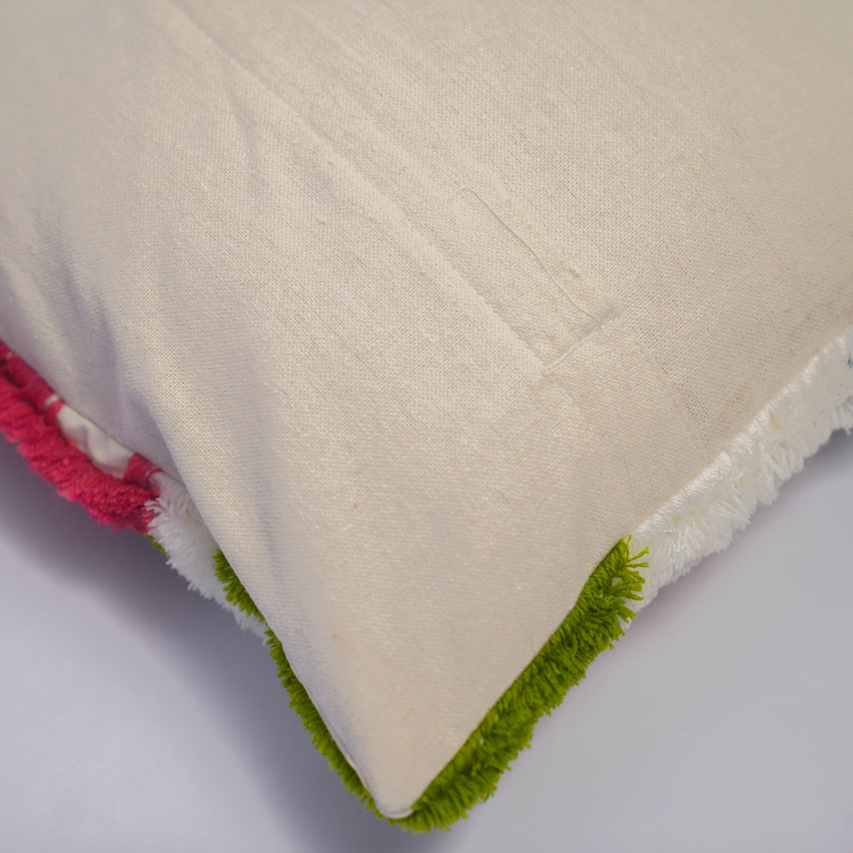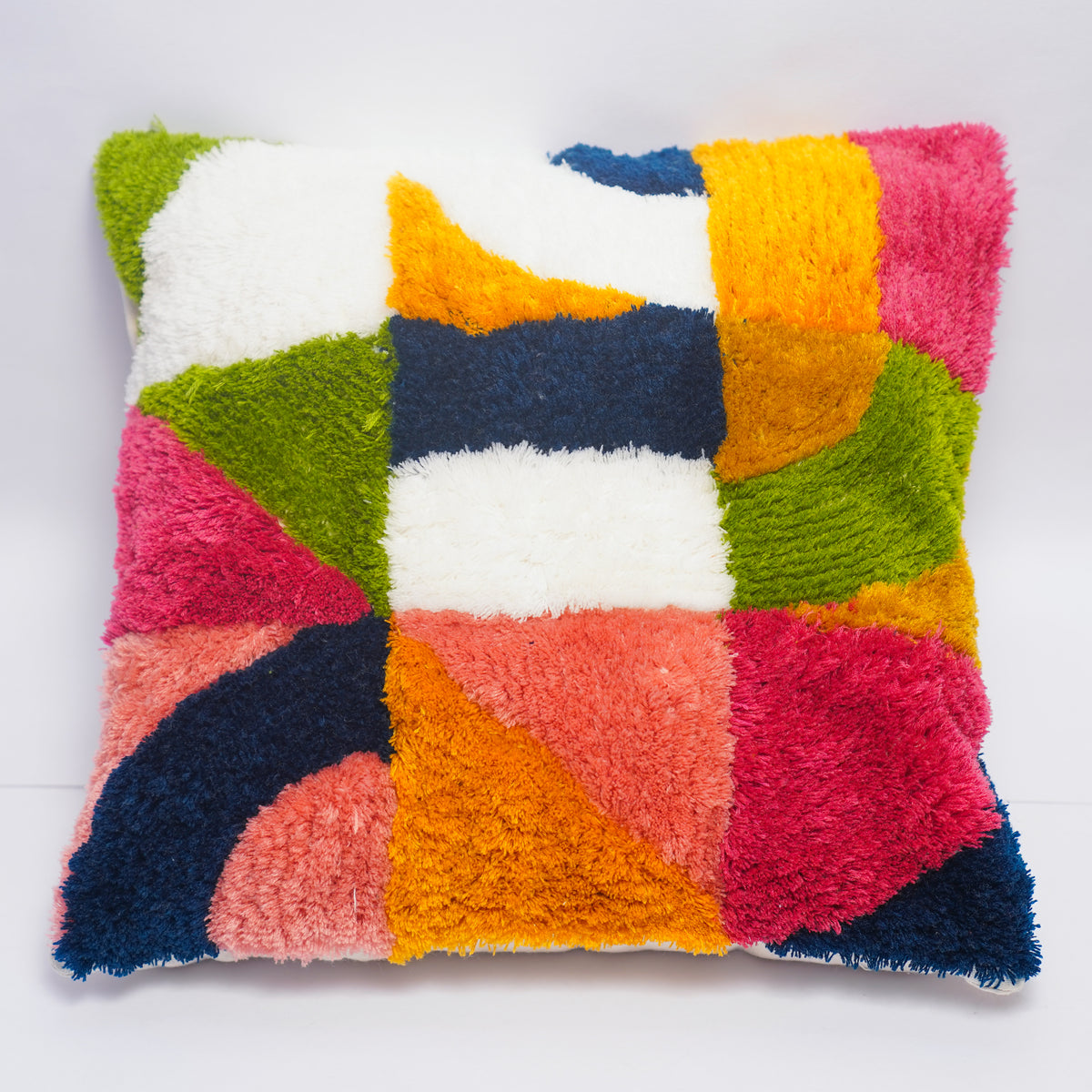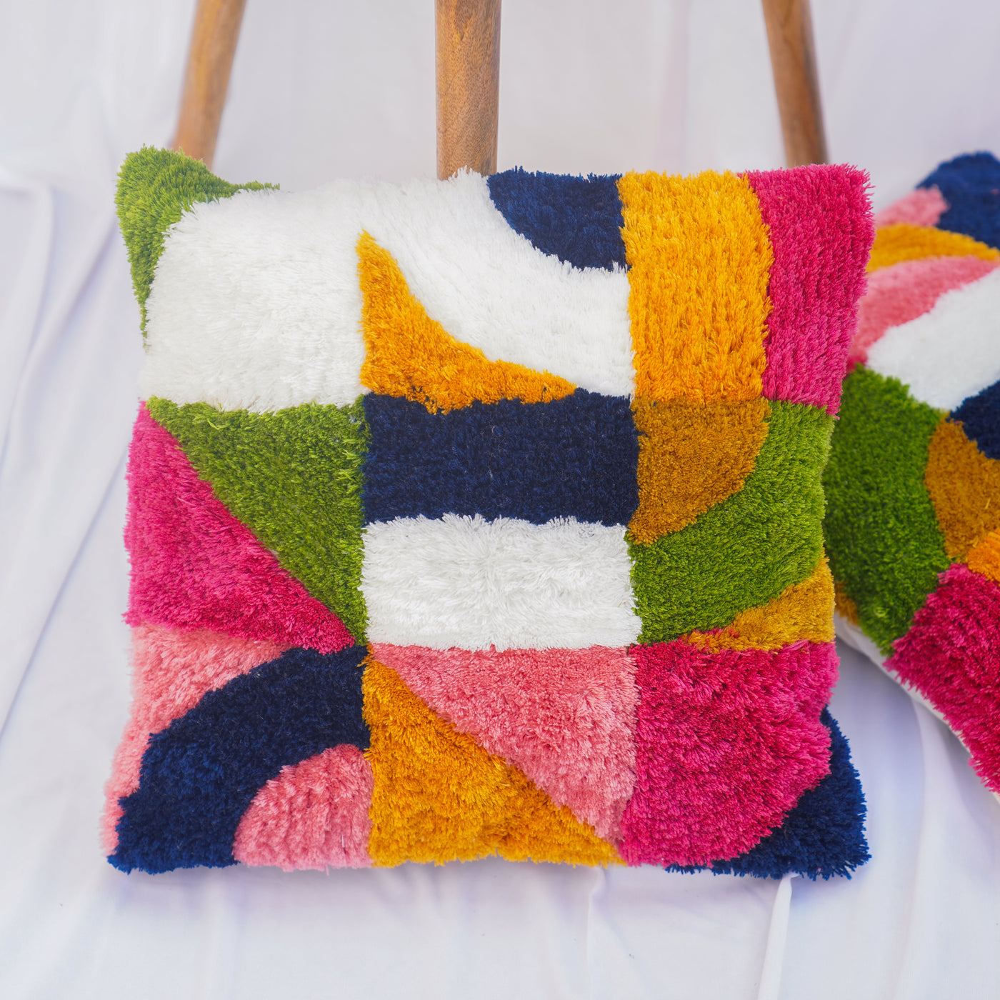 Beautifully hand tufted cushion cover on a cotton base, featuring a stunning multicolored abstract pattern. The intricate tufting creates a textured dimensional design that adds depth and visual interest to any room.