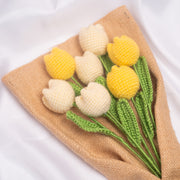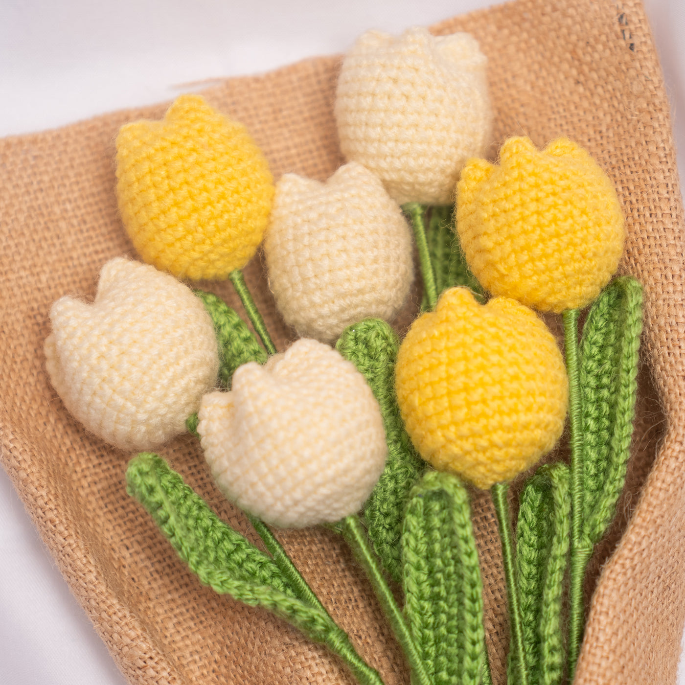 Bring a touch of handmade charm to your life with our beautiful crochet bouquet. Featuring soft yellow & cream blooms with green stems, wrapped in a rustic jute cover, this unique piece stands 11 inches tall.